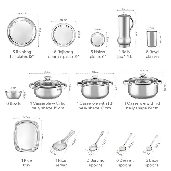 • Included Components: 6 N Rajbhog Full Plates 12", 6 N Rajbhog Quarter Plates 9", 6 N Halwa Plates 6", 1 N Belly Jug 1.4 L, 1 N Rice Tray, 1 N Rice Server, 1 N Casseroles 15 cm, 1 N Casseroles 17 cm, 1 N Casseroles 19 cm, 6 N Bowls 6", 6 N Royal Glasses, 6 N Dessert Spoons, 6 N Baby Spoons, 3 N Serving Spoons
