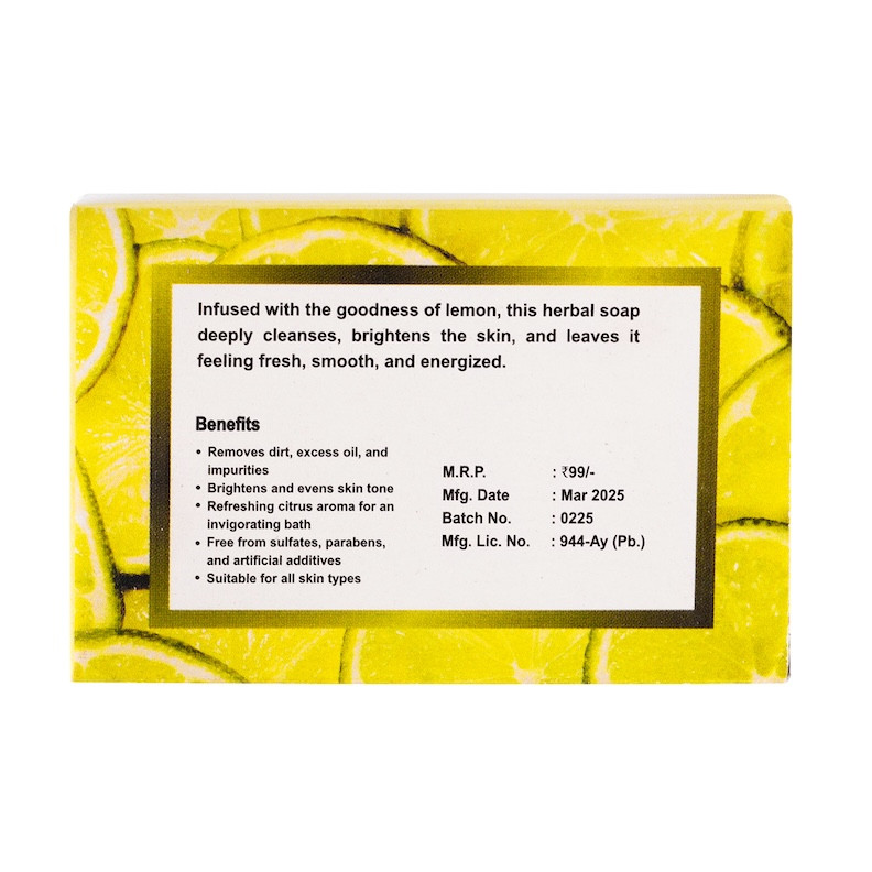 Lemon extract helps remove excess oil, brightens dull skin, and offers a naturally antibacterial cleanse. Glycerin deeply moisturizes, preventing dryness and leaving your skin soft and smooth. Enhanced with sugandhit dravya for a light, invigorating fragrance, this herbal soap offers a refreshing bathing experience every day.