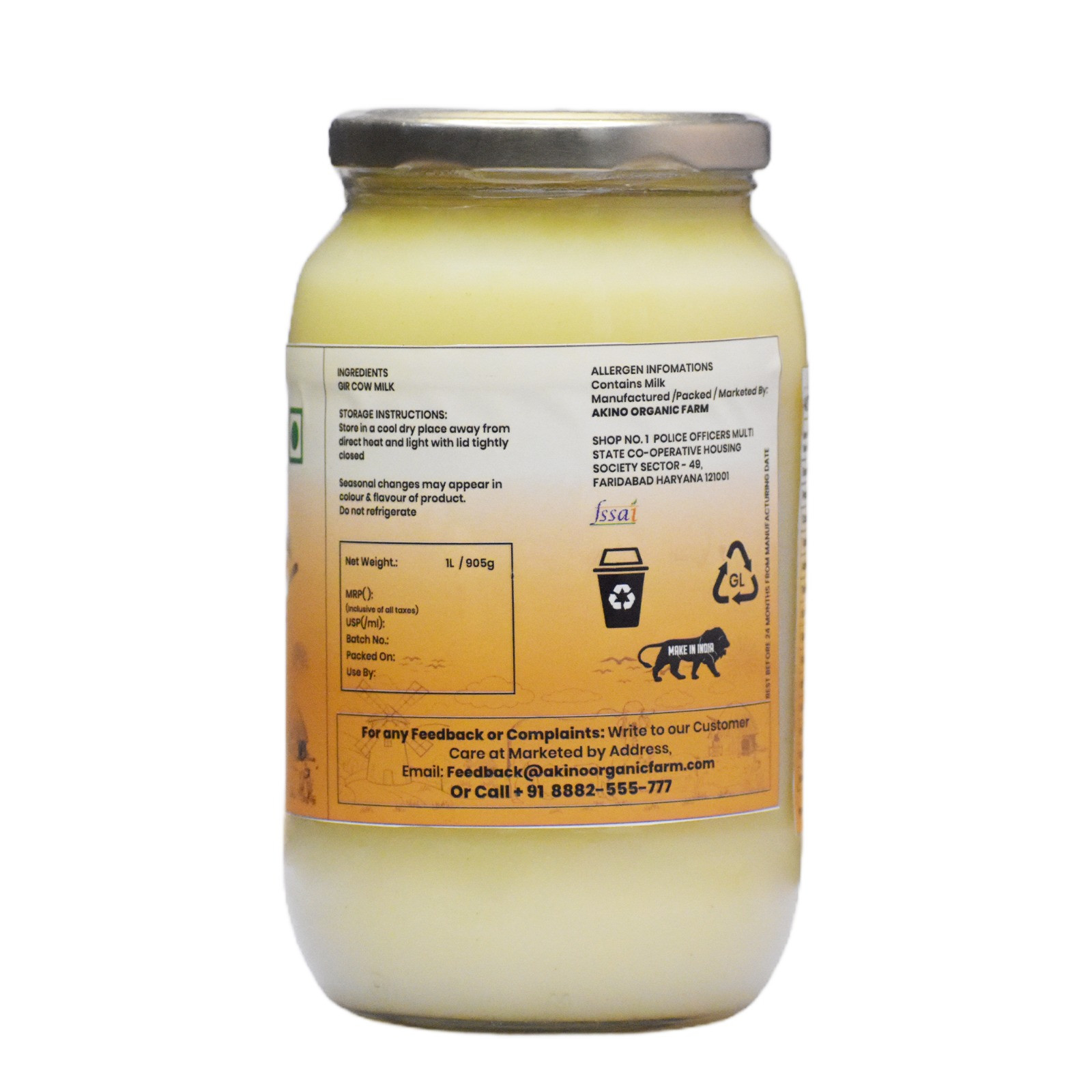 Akino Organic Farm Gir A2 Bilona Cow Ghee ek premium quality desi ghee hai jo Gir cows ke milk se traditional bilona method se banaya jata hai. Is process me dahi ko wooden bilona se churn karke makkhan nikala jata hai aur slow heating se shuddh ghee banaya jata hai. Is ghee ka natural aroma, golden color aur granular texture iski purity ko show karta hai. Ye ghee naturally rich hota hai healthy fats, Omega-3 fatty acids aur vitamins se jo digestion aur immunity ke liye beneficial hote hain. Akino Organic Farm ka aim hai pure aur natural dairy products provide karna bina kisi chemical ya preservatives ke. Ye ghee cooking, frying, sweets, Ayurvedic use aur daily diet ke liye ideal hai. Agar aap authentic traditional desi ghee search kar rahe hain to Akino Organic Farm Gir A2 Bilona Cow Ghee perfect choice hai.